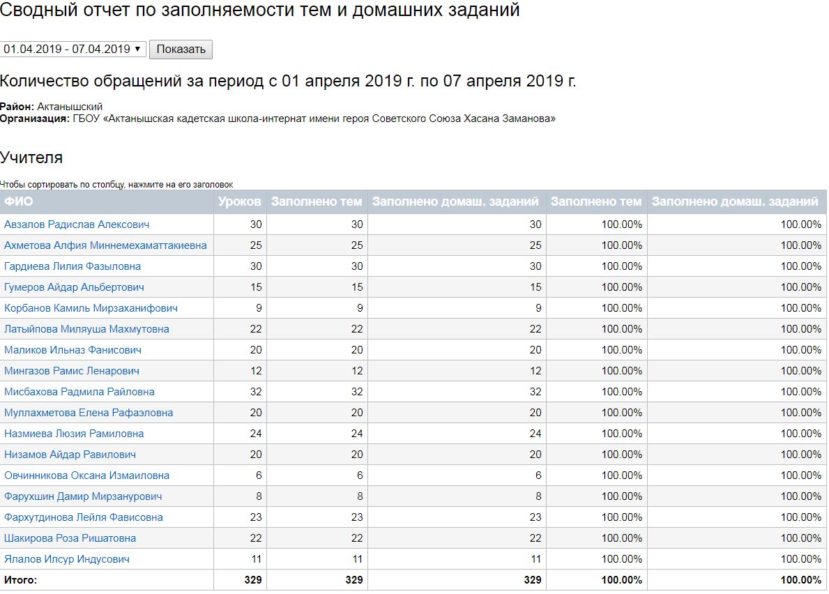 Сводный отчет по заполняемости тем и домашних заданий (01-07.04.2019)