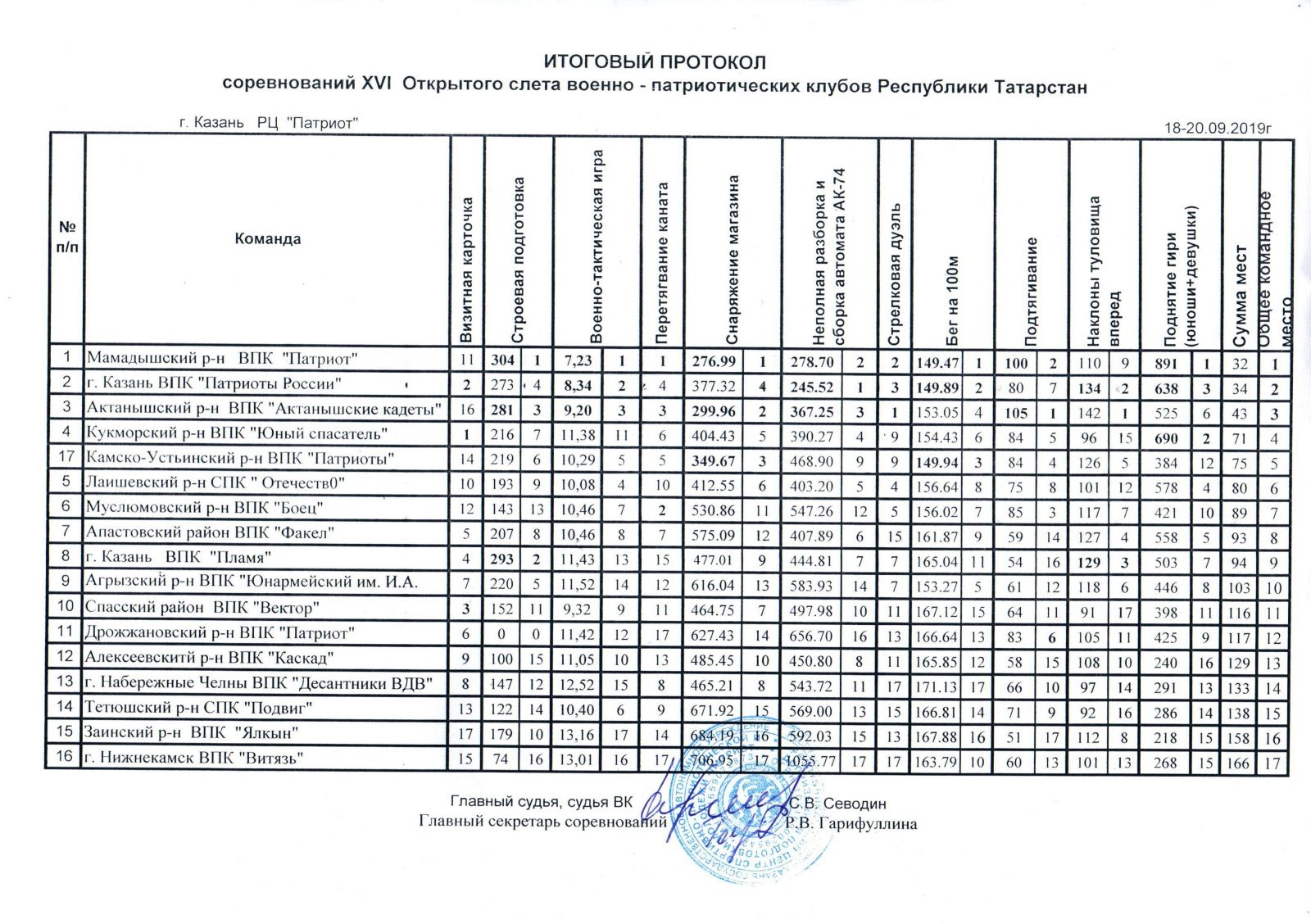 Опубликовано: 23.09.2019С 18 по 20 сентября на базе Республиканского центра спортивно-патриотической и допризывной подготовки молодежи «Патриот» г.Казани прошел XVI Открытый слет военно-патриотических клубов Республики Татарстан. В мероприятии приняли участие 200 человек в возрасте от 14 до 16 лет, представляющие 16 команд районов и городов республики.