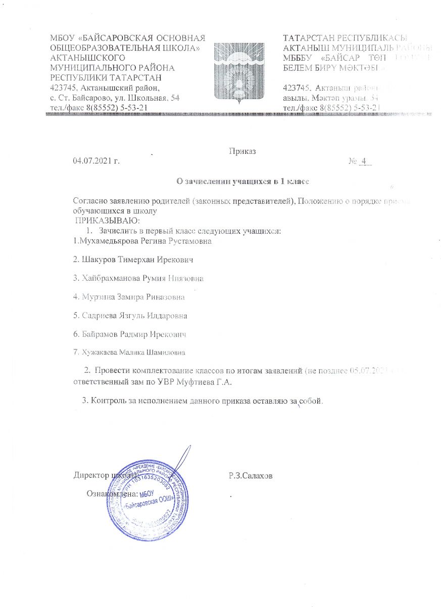 Приказ о зачислении в 1 класс на 2021/2022 учебный год