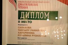 На VII Международный литературный конкурс "Джалильские чтения" поступило 40 тысяч заявок из разных регионов страны. В номинации "Джалиль на татарском языке" ученица 8 класса Хайбрянова Рузалина и ученица 8 класса Салахова Тансылу заняли 2 место. Им были вручены диплом и денежное вознаграждение в размере 7 тысяч рублей. Поздравляем!