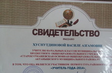 "Ел укытучысы 2014" район конкурсында башлангыч класс укытучысы Хөснетдинова Вәсилә Әзъгәм кызы катнашучы таныклылыгына ия булды. Әфарин! 03.03.2014
