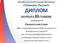 Татарстан Республикасы хәрби комиссириаты үткәргән "Россия патриотлары" республика конкурс-фестивалендә безнең мәктәп укучылары да катнаштылар. "Нәфис сүз" номинациясендә 1 нче сыйныф укучысы Гәрәева Зәлинә һәм 3 нче сыйныф укучысы Рахматуллин Самат 3 нче дәрәҗә дипломга ия булдылар. Котлыйбыз. Укытучылары Газизова Д.М.