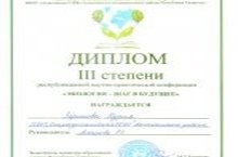 26 ноября прошла научно-практическая конференция «Экология - шаг в будущее» на базе муниципального бюджетного общеобразовательного учреждения «Апастовская средняя общеобразовательная школа с углубленным изучением отдельных предметов» Апастовского муниципального района Республики Татарстан. На этой конференции участвовала ученица 9 класса Зарипова Нурия в экологической секции и награждена дипломом 3 степени. Руководитель-учитель биологии и химии Аскарова Рамиля.