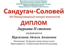 XIII Халыкара “Сандугач-Соловей” вокалистлар бәйгесендә катнашып җырчы кызларыбыз Нургалиева Айгизә 3 урынны, Нургалиева Айзилә 2 урынны яуладылар. Котлыйбыз!