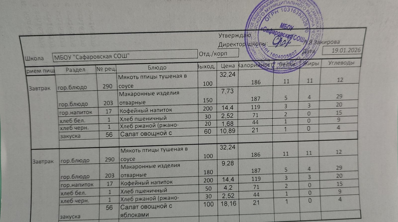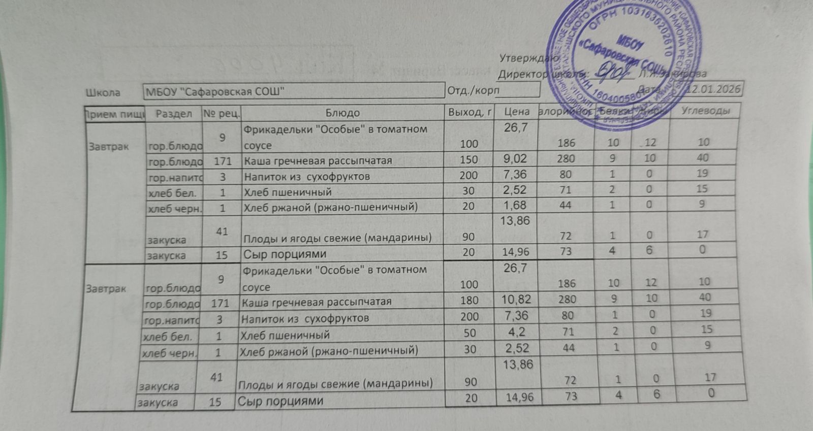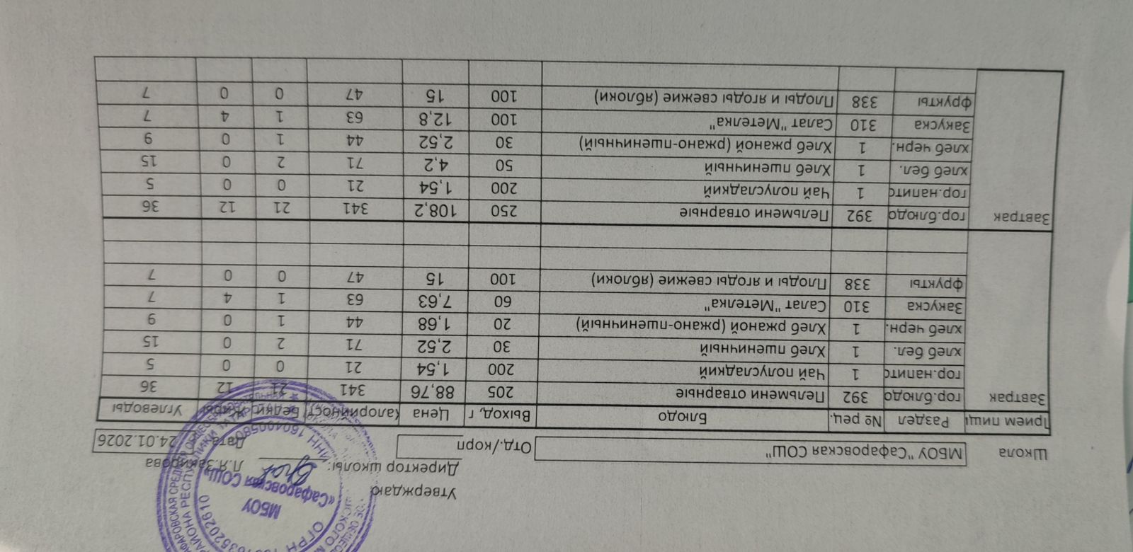 Однодневные меню на 2025-2026 учебный год
