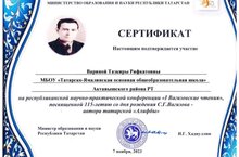 Сегодня, 7 ноября, в честь 115-летия со дня рождения автора книги «Алифба» Салая Вагизова в Арском районе было организовано масштабное республиканское мероприятие.Наша коллега Варина Тазира Рифкатовна,выступив достойно,получила сертификат.
