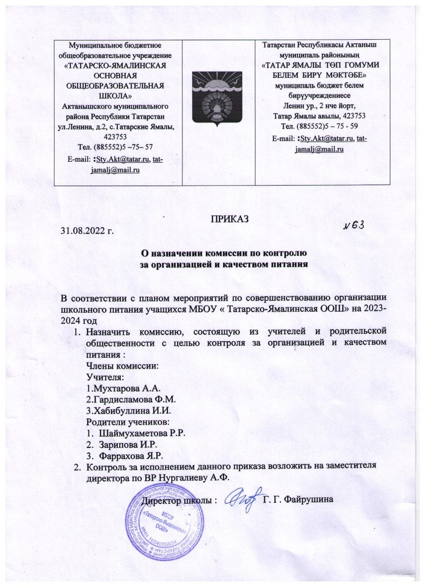 Приказ "О назначении комиссии по контролю за организацией и качеством питания".