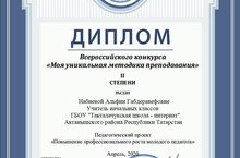 Диплом 01.04.2020 Дипломом II степени Всероссийского конкурса "Моя уникальная методика преподавания " награждена учитель начальных классов А.Г.Набиева. Желаем дальнейших творческих успехов!