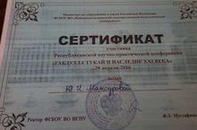 13 мая учитель русского языка Р.С.Амирова и учитель-логопед Ю.И.Мансурова участвовали в V Республиканской научно-исследовательской конференции "Гамил Афзал укулары " и были награждены дипломами Министерства образования и науки РТ за 3 место.