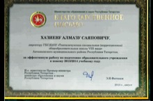 Мәктәпләрне яңа 2013-2014 нче уку елына әзерлеге йомгаклары буенча нәтиҗәле хезмәте өчен мәктәбебез директоры Хазиев Алмаз Сәяф улы Татарстан Республикасы фән һәм мәгариф министрының Рәхмәт хаты белән бүләкләнде. Хөрмәтле Алмаз Саяпович! Мәктәбебез коллективы Сезне әлеге уңайдан ихлас котлап, алга таба да көчле рухлы, аек фикерле, зирәк акыллы, булдыклы җитәкче булып калуыгызны тели.