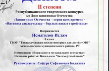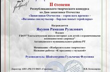 8 класс укучысы Якупов Рамазан Республика күләмендә уздырылган "Ватанны саклаучылар-барлык вакыт геройлары" конкурсында катнашып 2 нче дәрәжәдәге дипломга лаек булды. Житәкчесе: Шайхенурова Г. Ф.