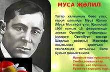Бөек татар шагыйре Муса Җәлилнең туган көне. 2023 елның 15 февралендә бөек татар шагыйре, Советлар Союзы Герое Муса Җәлилнең тууына 117 ел тула. Аның гуманизм һәм батырлык белән сугарылган шигырьләрендә бер буын гына тәрбияләнмәгән. Шул уңайдан, безнең мәктәптә “Муса Җәлил — безнең герой"дип исемләнгән чара узды. Укучылар шагыйрьнең биографиясен искә төшерделәр, аның әсәрләрен укыдылар һәм әсәрләре буенча рәсемнәр ясадылар. _____________________________________________ День рождения М.Джалиля 15 февраля 2023 года исполняется 117 лет со дня рождения великого татарского поэта, Героя Советского Союза Мусы Джалиля. На его стихах, проникнутых гуманизмом и мужеством, было воспитано не одно поколение. В связи с этой датой в нашей школе прошло мероприятие под названием “Муса Джалиль — наш герой". Учащиеся вспомнили биографию поэта, прочитали его прозведения и нарисовали рисункки по его прозведениям.