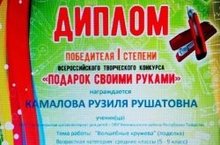 Ученица 8 класса Камалова Рузиля приняла участие во Всероссийском творческом конкурсе "Подарок своими руками" и награждена Дипломом I степени.Руководитель Билалова С.С.