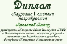 В конкурсе художественного чтения,посвященного 100-летнему юбилею Г.Афзала "Туган тел" - Лауреатом 1 степени стал Арсланов Алмаз и был награжден Дипломом. Руководитель Мансурова Ю.И.Также Алмаз получил одноименный Диплом и под руководством воспитателя Салаховой Г.А.