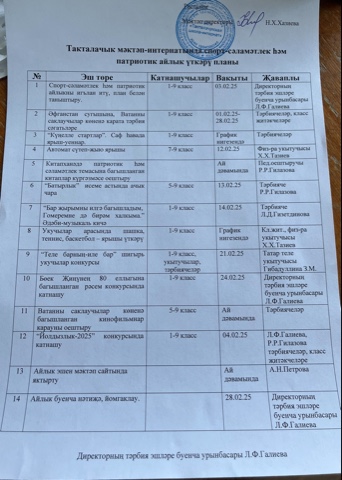 Такталачык мәктәп-интернатында спорт-сәламәтлек һәм патриотик айлык үткәрү планы.
