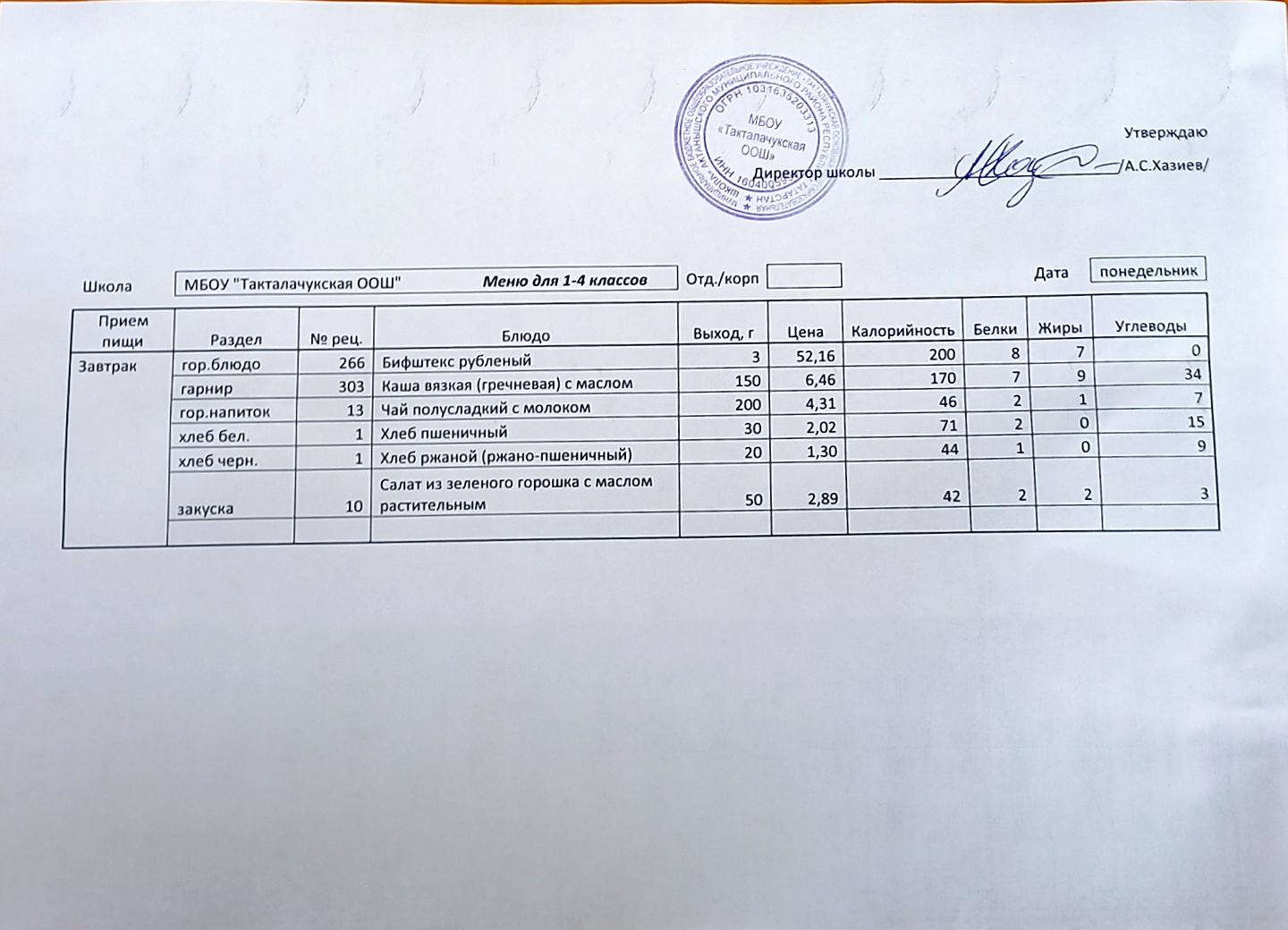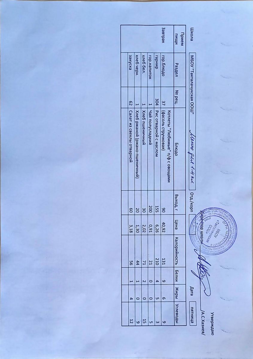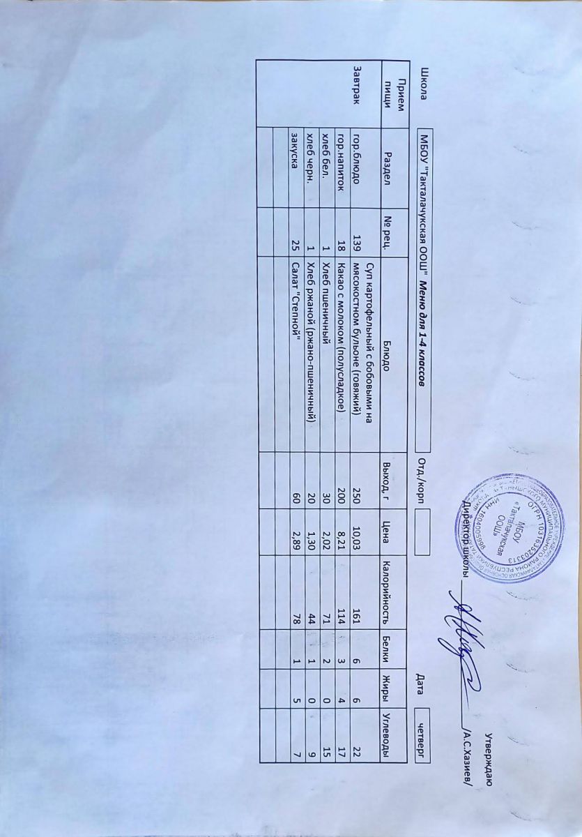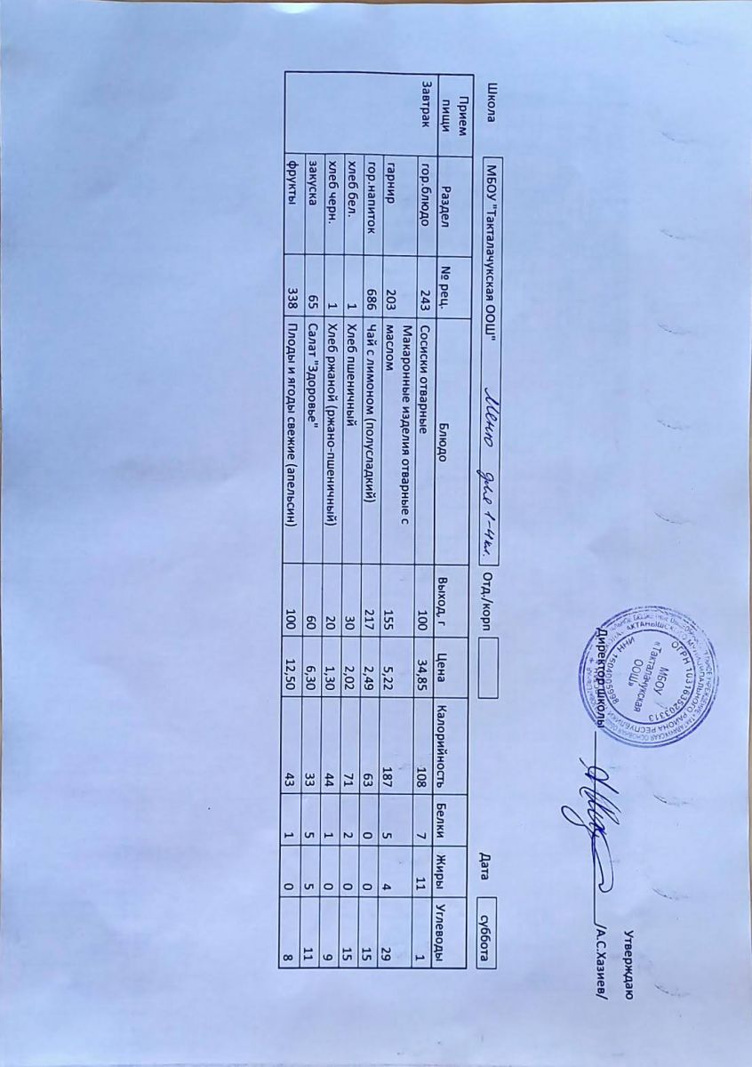 Однодневное меню 2024-2025 учебного года/ Көндәлек меню