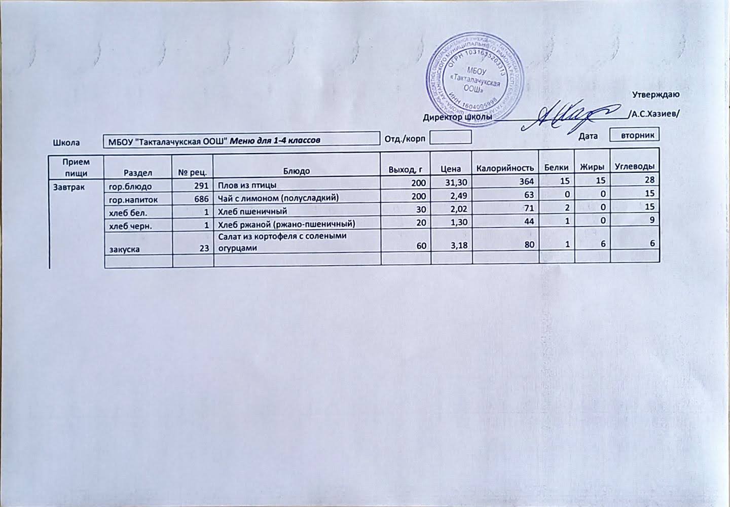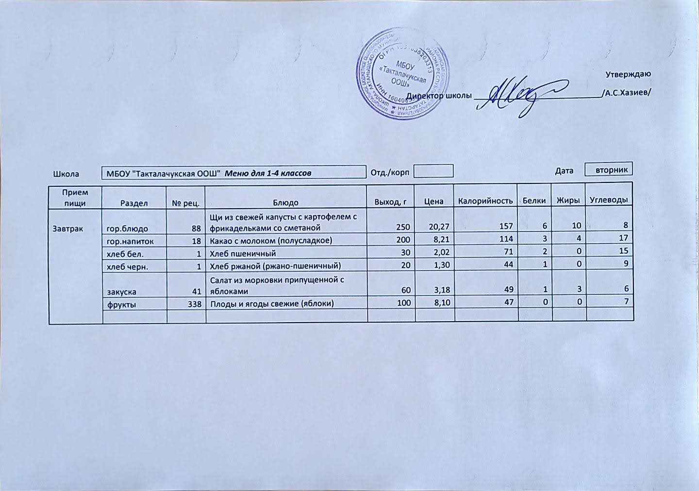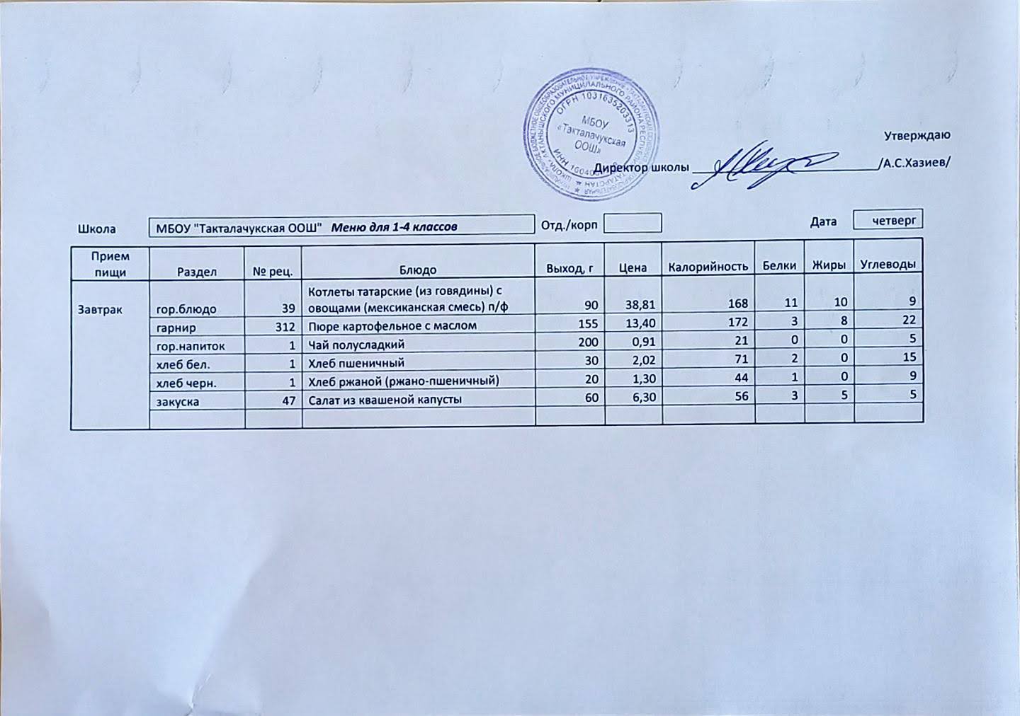 Однодневное меню 2024-2025 учебного года/ Көндәлек меню