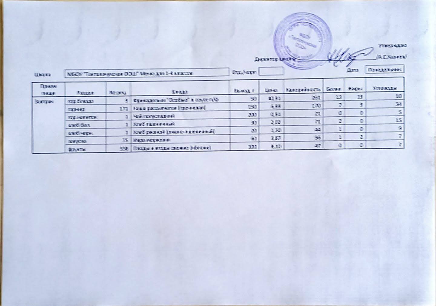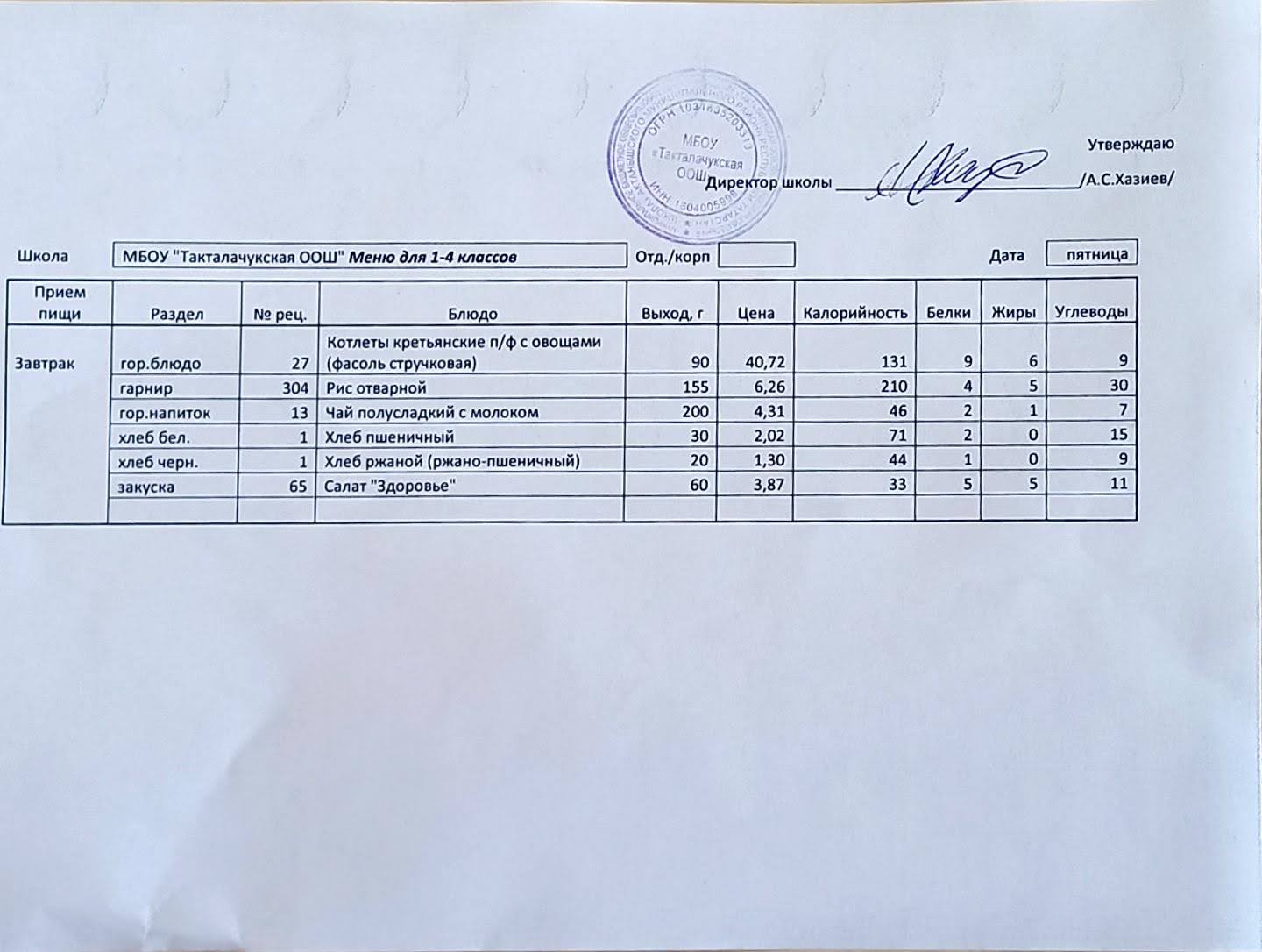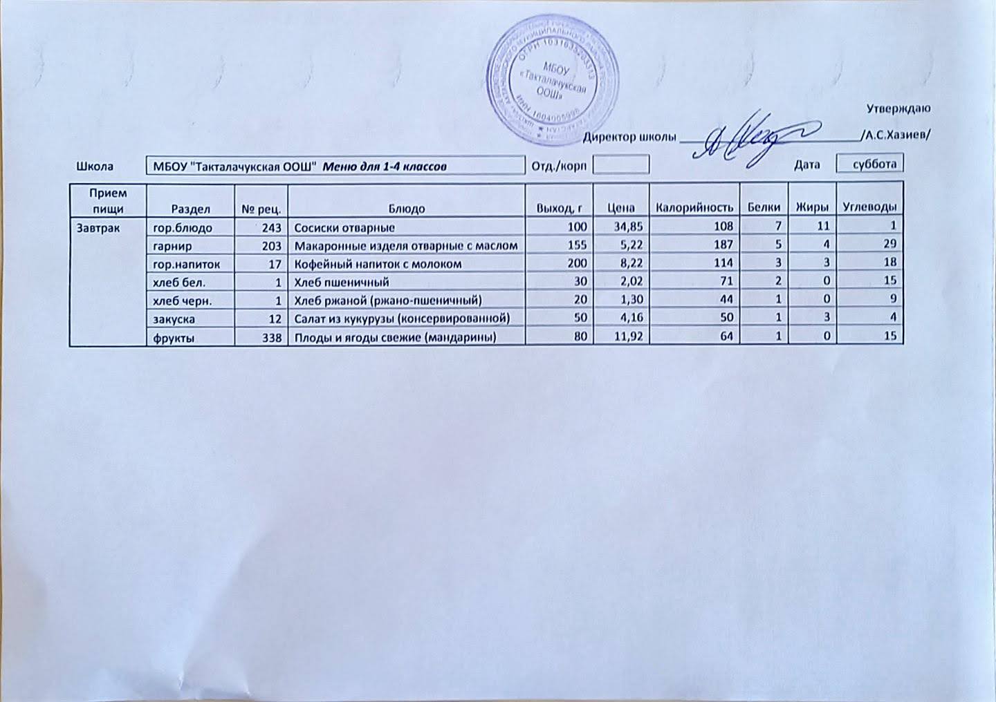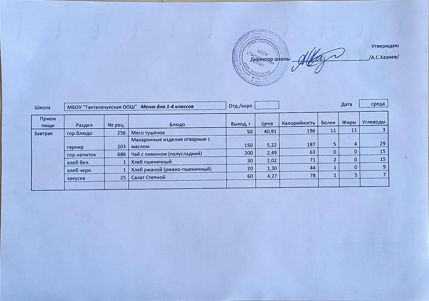 Однодневное меню 2024-2025 учебного года/ Көндәлек меню