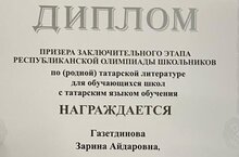 Ученица 8 класса стала призером на республиканской олимпиаде по родной (татарской) литературе. Выражаем благодарность и желаем дальнейших успехов в учебе.