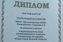 Театральный коллектив Такталачукской ООШ наградили дипломом за активное участие в республиканском конкурсе театральных постановок "Юные герои Великой Победы".