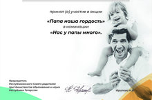 Подведены итоги акции "Папа - наша гордость", посвященной ко Дню защитников Отечества. По итогам акции, ученик 7 класса Мукимов Шамиль удостоен сертификата в номинации "Нас у папы много".