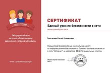 7,8,9 укучылары баысы да информацион куркынычсызлык буенча "Единый урок безопасности в сети интернет" кысаларында Бөтенрәсәй контроль эшен интернет тестирование формасында үттеләр һәм сертификатка ия булдылар. Җитәкчеләре - информатика укытучысы Г.А.Хабиров.