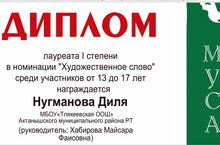 Муса Җәлилгә багышланган "Кызыл ромашка" исемендәге 2нче Республика конкурсында Ногманова Дилә һәм Алинә шигырь сөйләү буенча 1нче дәрәҗә лауреат дипломнары белән бүләкләнделәр. Җиәкчеләре - Хәбирова Мәйсәрә Фаис кызы.