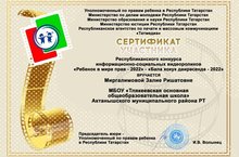 “Бала хокук даирәсендә – 2022” конкурсы/Конкурс «Ребенок в мире прав» 28.11.2022 6 сыйныф укучысы Миргалимова Зәлия Республикакүләм үткәрелгән “Бала хокук даирәсендә – 2022” информацион – социаль видеороликлар конкурсында катнашып, сертификат белән бүләкләнде. Ученица 6 класса Миргалимова Залия участвовала на Республиканском конкурсе информационно – социальных видеороликов «Ребенок в мире прав», организованный Уполномоченным по правам ребенка РТ, Министерством по делам молодежи РТ, Министерством образования и науки РТ, Министерством юстиции РТ, Республиканским агентством по печати и массовым коммуникациям РТ и награждена сертификатом.