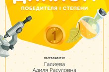 5 ноября На международном проекте "Videouroki.net" в олимпиаде по биологии ученик 6 класса Галиева Адиля Расуловна стала победителем и получил Диплом 1 степени. Учитель - Хабиров Газинур Анзяпович.Молодцы!/ 5нче ноябрьдә Халыкара " Vide-ouroki.net" проектының биология олимпиадасында 6нче класс укучысы Галиева Адиля Рәсүл кызы җиңүче булды һәм 1нче дәрәҗә диплом белән бүләкләнде. Укытучысы Хабиров Газинур Анзяпович. Әфарин!