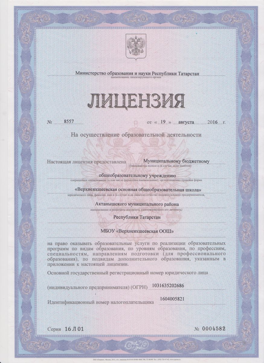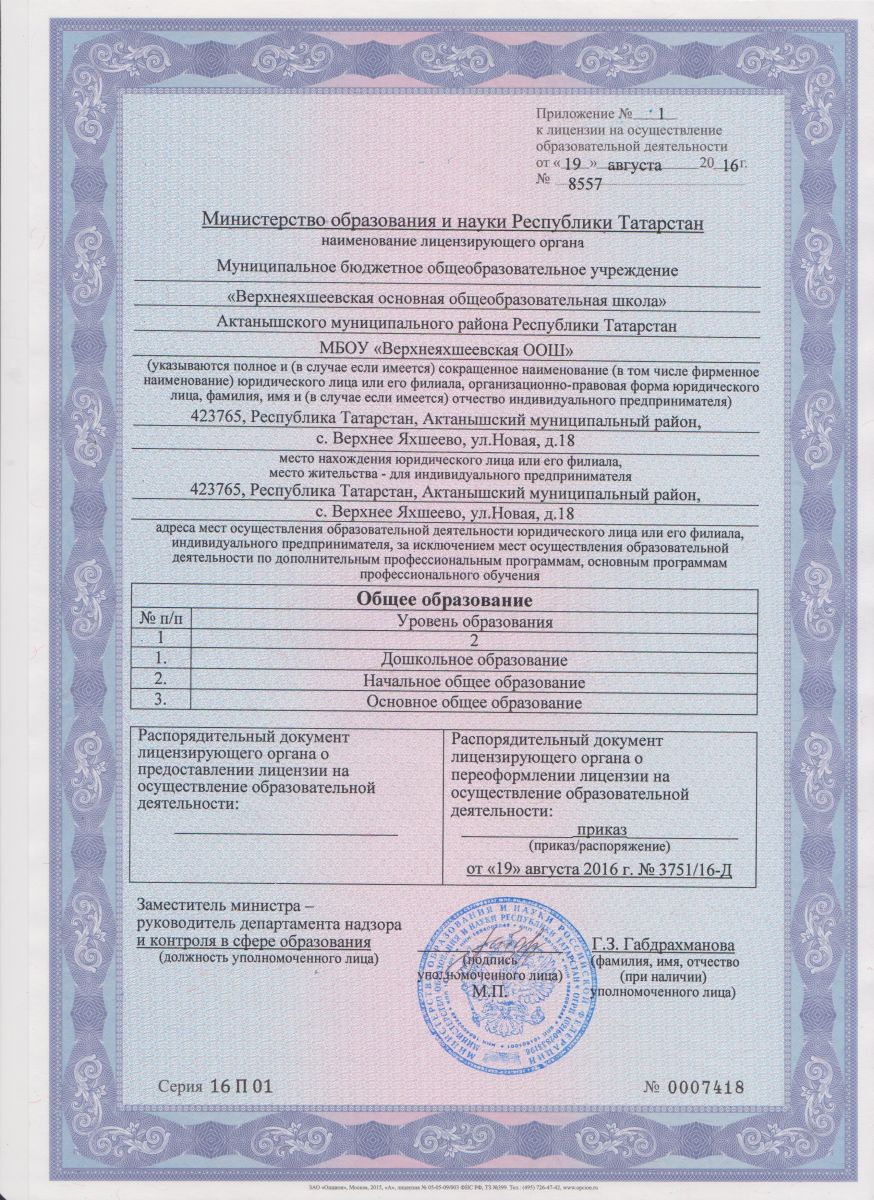 Лицензия на осуществление образовательной деятельности (с приложениями) / Белем бирү эшчәнлеген тормышка ашыру лицензиясе (кушымталары белән)
