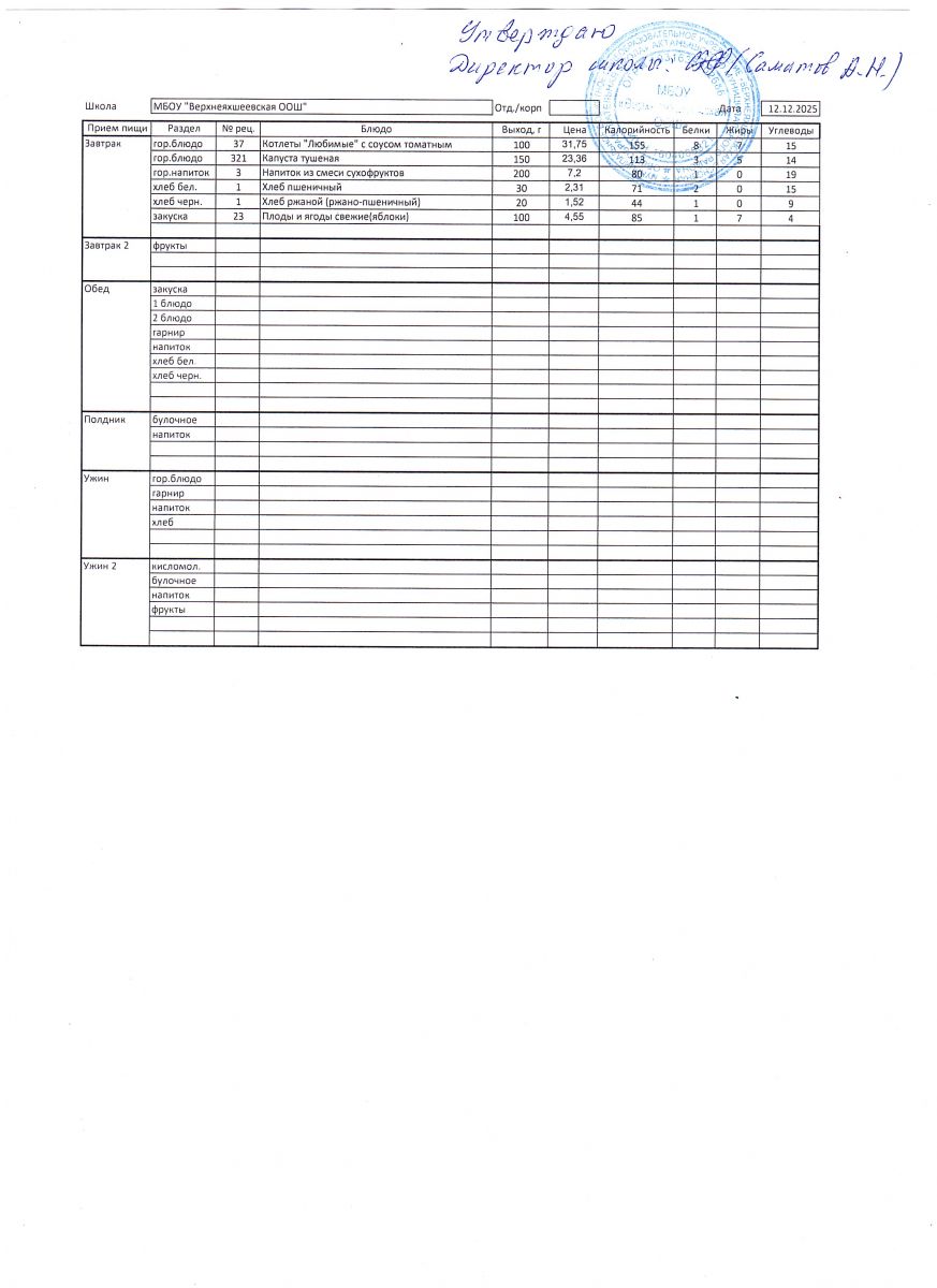 примерное двенадцатидневное меню для организации бесплатного питания в начальных классах