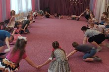 Учились играть в чувашскую народную игру " Луна и солнце" (Уйохпа хэвель). Дети поделились на команду " Солнце" и команду " Луна" и старались перетянуть друг друга через условную черту. Дети весело и эмоционально проиграли в новую интересную игру.