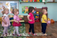 Занятие по физической культуре во второй группе раннего возраста. Дети учились ходить в разных направлениях, не наталкиваясь друг на друга, упражнялись в ходьбе по доске.