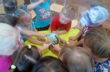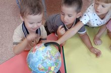 В рамках тематического дня "Вокруг света", дети младшей группы знакомились с условными обозначениями суши и воды на глобусе. Воспитатель Зайцева М.Е. -