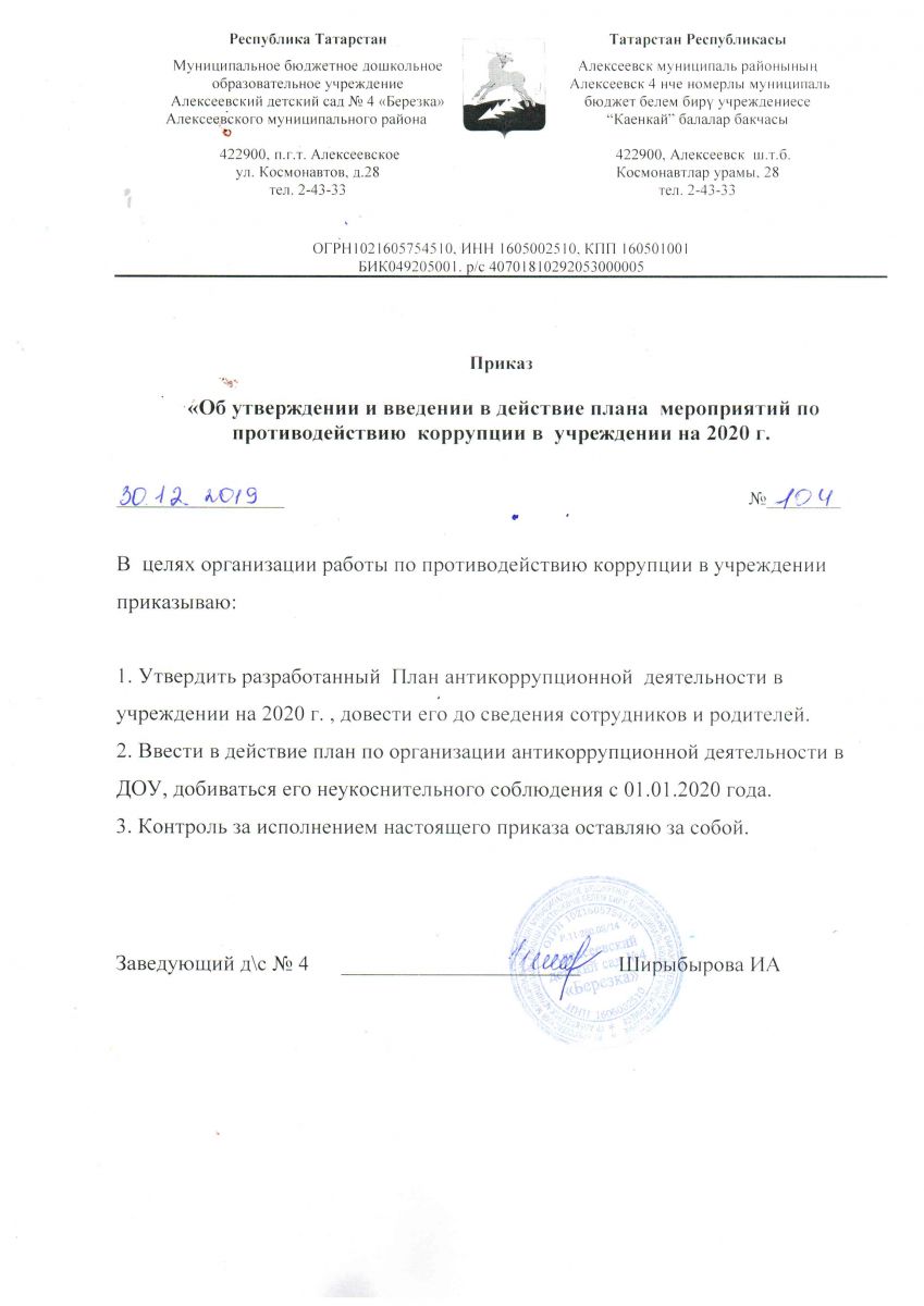 Приказ " Об утверждении и введении в действие плана мероприятий по противодействию коррупции в учреждении на 2020 год"