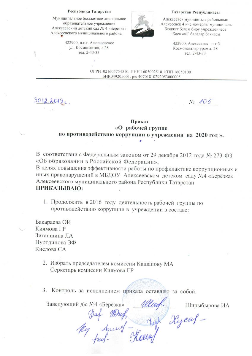Приказ " О рабочей группе по противодействию коррупции в учреждении на 2020 год"