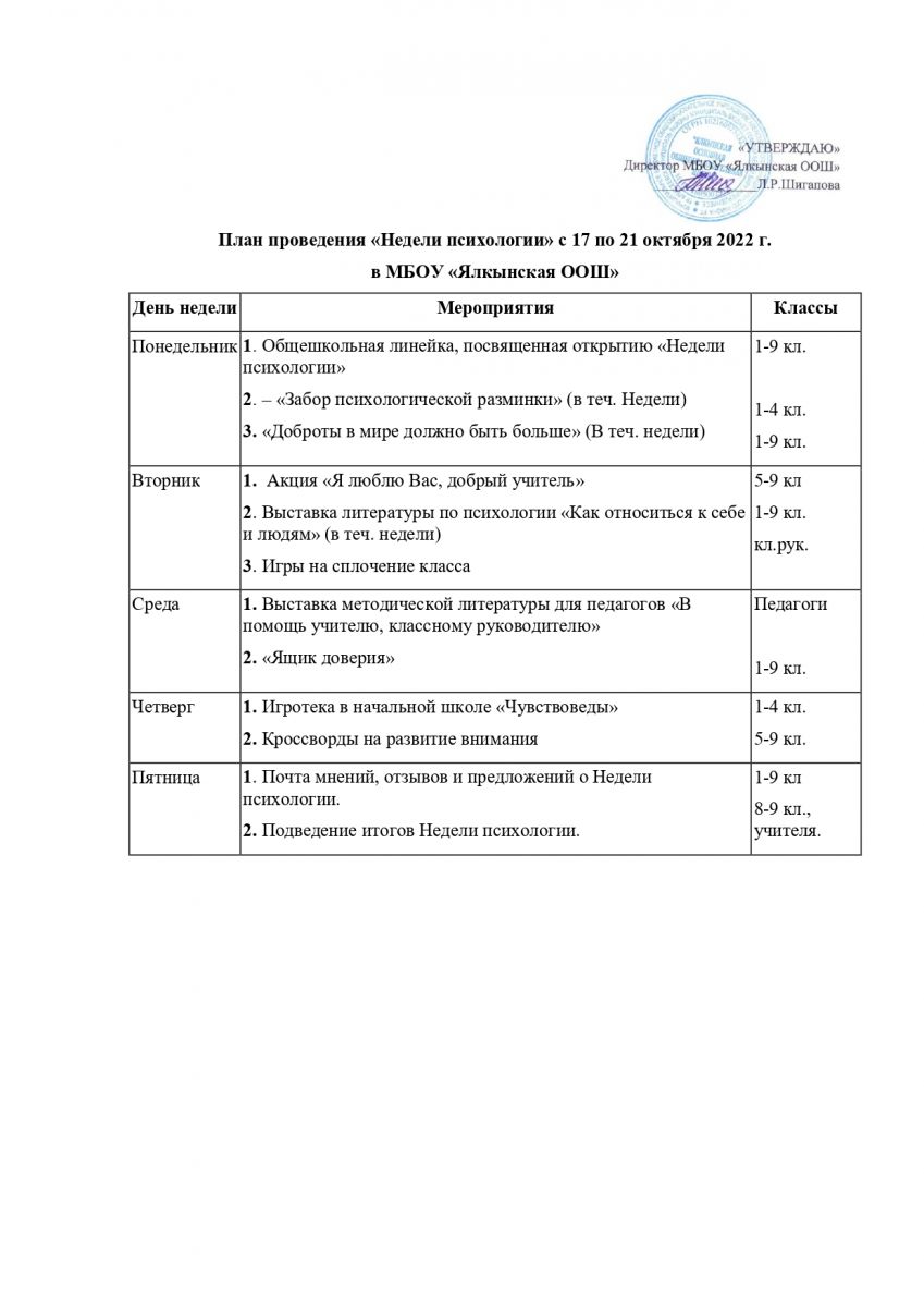 План проведения «Недели психологии» с 17 по21 октября 2022 г.