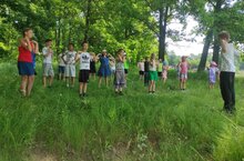 Начали мы наш день, как всегда, с зарядки, чтобы ребята получили заряд бодрости на весь день. После была проведена минутка безопасности «Правила поведения на природе, первая помощь при укусе насекомых, змей».