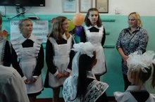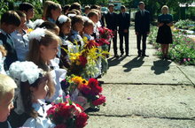 После символического первого звонка, который дали первоклассница в сопровождении выпускника, нового учебного года, собравшиеся прошли в здание школы, где их ждал первый урок, посвященный Уроку Мира.