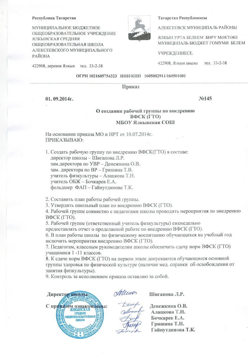 Приказ «О создании рабочей группы по внедрению ВФСК (ГТО)