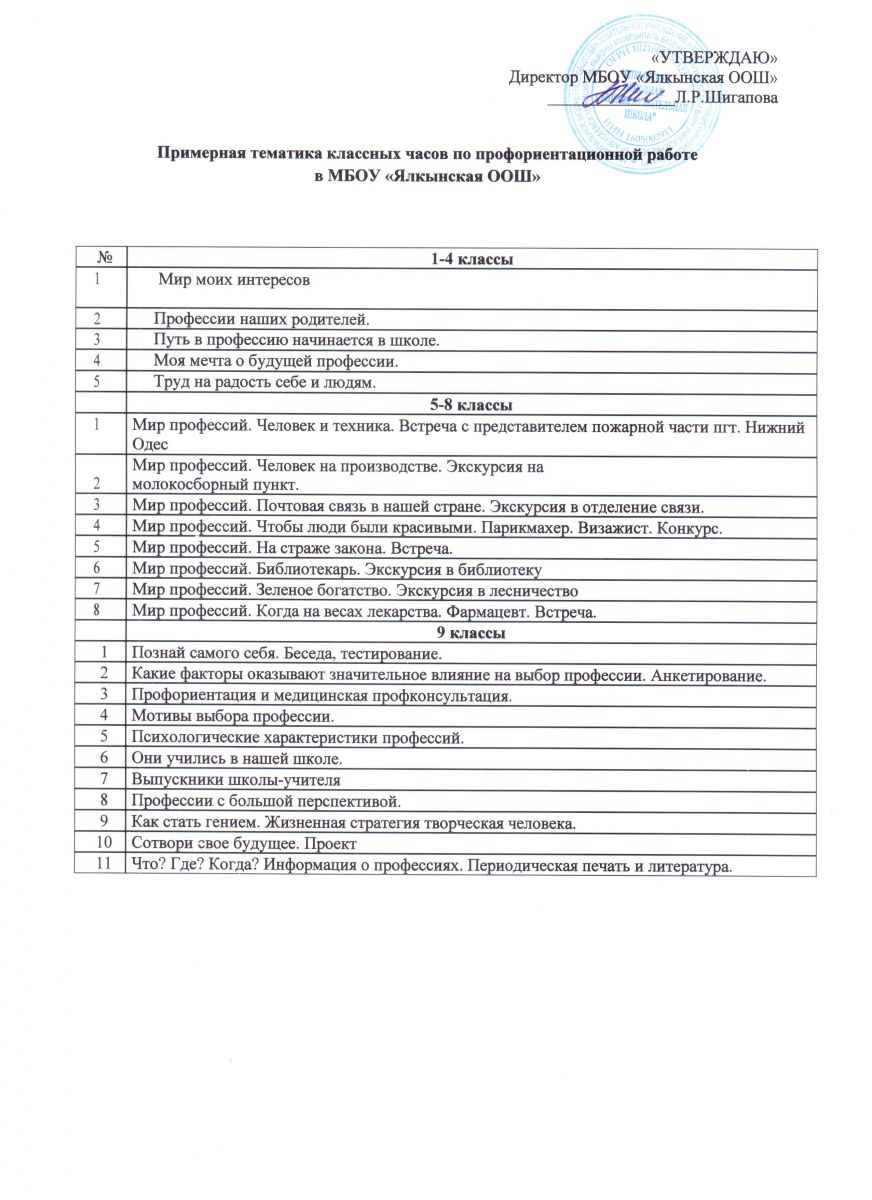 Примерная тематика классных часов по профориентационной работе МБОУ «Ялкынская ООШ»