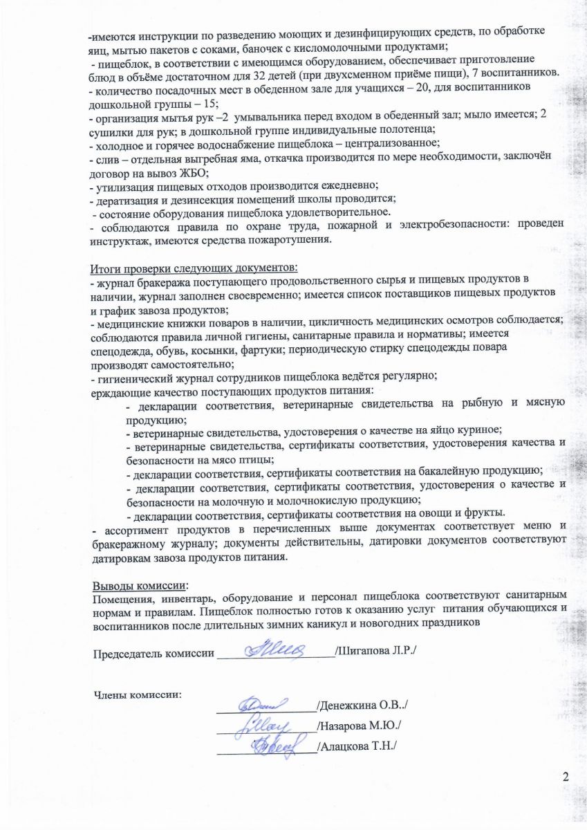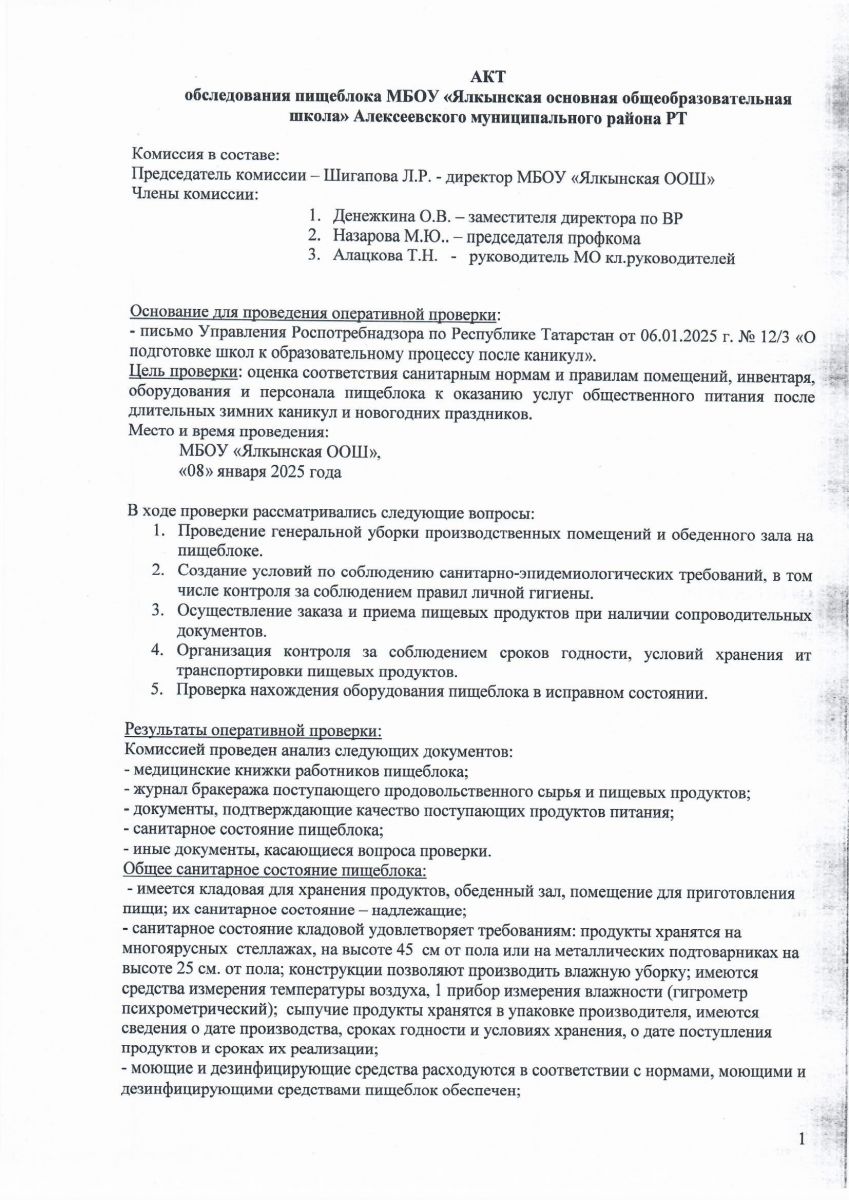 Акт проверки пищеблока январь 2025 г