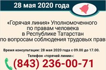 Получить исчерпывающую информацию, разъяснить спорные ситуации гражданам помогут представители Уполномоченного по правам человека в Республике Татарстан, Прокуратуры Республики Татарстан, Министерства труда, занятости и социальной защиты Республики Татарстан и Государственной инспекции труда по Республике Татарстан.Телефон «горячей линии»: (843) 236-00-71.Время консультации: с 09.00 до 17.00. -