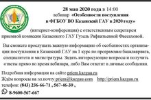 Вебинар с ответственным секретарем приемной комиссии Казанского ГАУ 27.05.2020 В последнее время, в условиях сложившейся эпидемиологической обстановки в Республики и в целом по России, от учащихся 11 классов и их родителей поступают вопросы связанные с особенностями поступления в вузы в 2020 г. В четверг, 28 мая 2020 года, в 14:00 по московскому времени состоится вебинар (интернет-конференция) с ответственным секретарем приемной комиссии Казанского ГАУ Гузель Рафкатьевной Фассаховой (ссылка размещена на официальном сайте Приёмной комиссии Казанского ГАУ priem.kazgau.ru).Все подключившиеся смогут прослушать важную информацию об особенностях поступления в Казанский ГАУ по программам бакалавриата, специалитета и магистратуры. Задать интересующие вопросы и получить ответы прямо во время вебинара, либо в личные сообщения.Также параллельно будет идти трансляция в официальных аккаунтах ВКонтакте и Instagram (ссылки есть на официальном сайте Приёмной комиссии Казанского ГАУ priem.kazgau.ru).