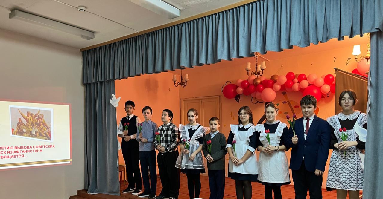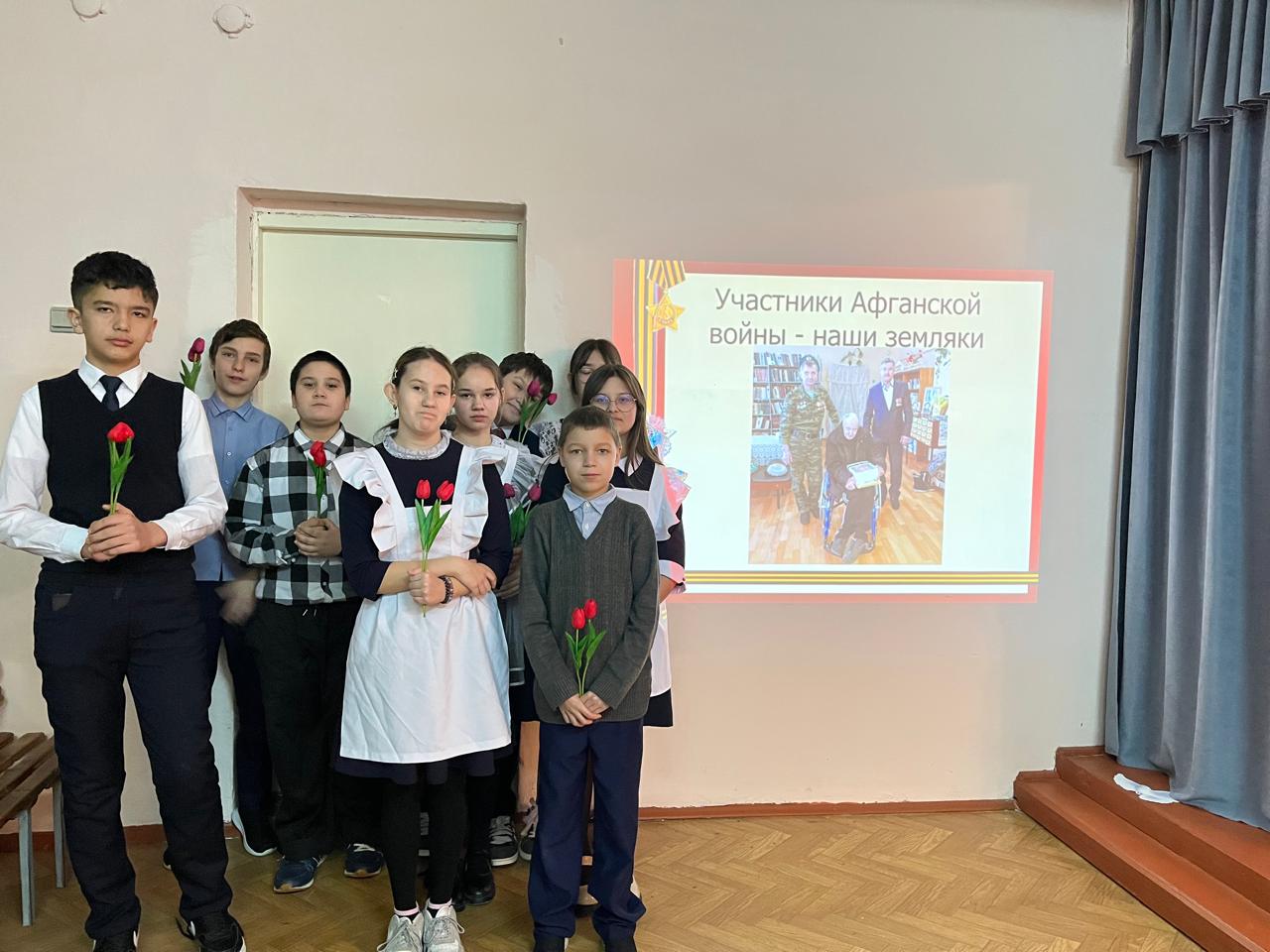 Классный руководитель Сергеева М.С. открыла мероприятие рассказом о событиях 1979-1989 годов. Ребята с интересом слушали рассказ, а также вспоминали о воинах-интернационалистах — наших земляках, прошедших дорогами Афганистана.