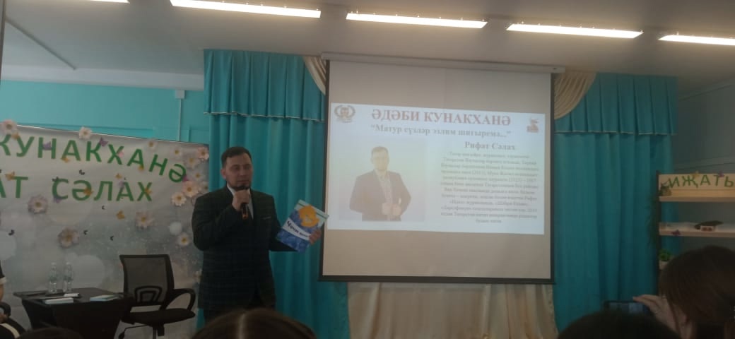 16 апрельдә,районыбызның туган (татар) теле һәм әдәбияты укытучылары өчен оештырылган “Әдәби кунакханә” проектының быел унөченче «Матур сүзләр эзлим шигыремә...» исемле очрашуы булып узды. “Әдәби кунакханә”нең быелгы кунагы -татар шагыйре, журналист, тәрҗемәче, Татарстан Язучылар берлеге әгъзасы, Төркия Язучылар берлегенең Намык Кемал исемендәге премиясе иясе, "Татнефть" АҖ һәм Татарстан Язучылар берлегенең Саҗидә Сөләйманова исемендәге, Муса Җәлил исемендәге республика премияләре лауреаты, Татарстан китап нәшриятының балалар һәм яшүсмерләр әдәбияты бүлегендә мөхәррир булып эшләүче Рифат Сәлах булды.