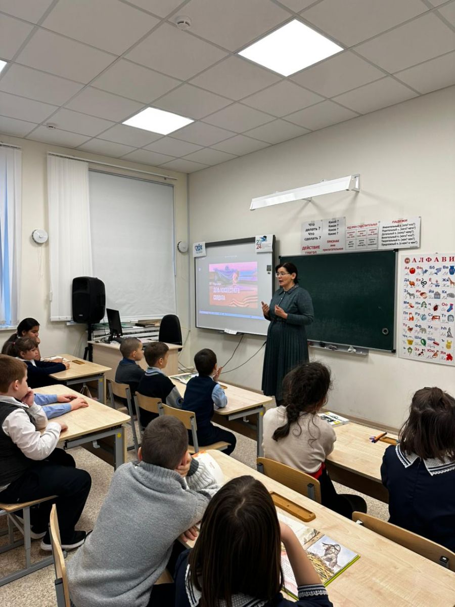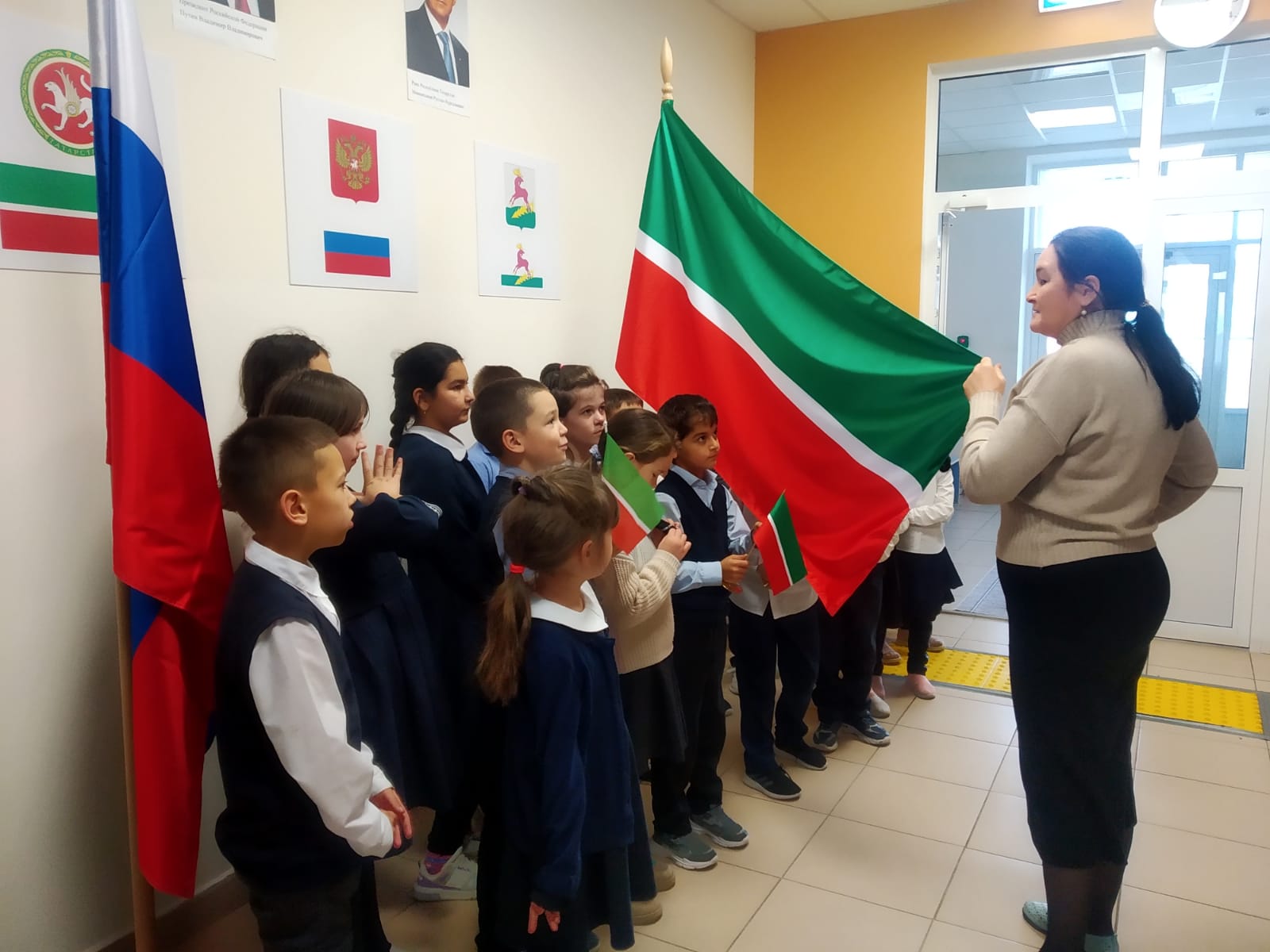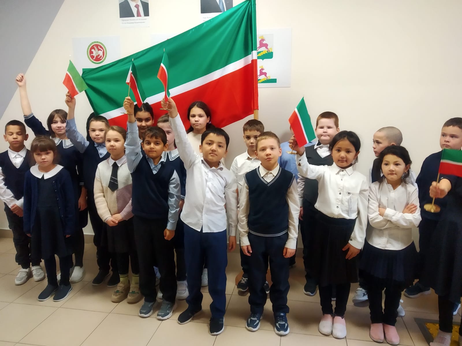 28 ноябрь в преддверии празднования Дня Государственного флага республики Татарстан, прошёл информационный час дня учащихся начальных классов. В ходе часа шёл разговор об истории создания флага республики, о том, что обозначают цвета триколора, в каких случаях поднимается флаг.