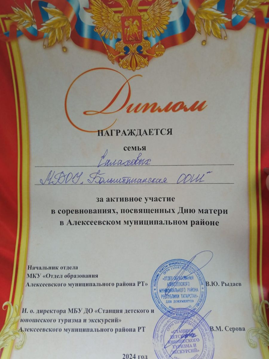 Дипломом награждается семья Салаховых за активное участие соревнованиях, росвященных Дню матери.