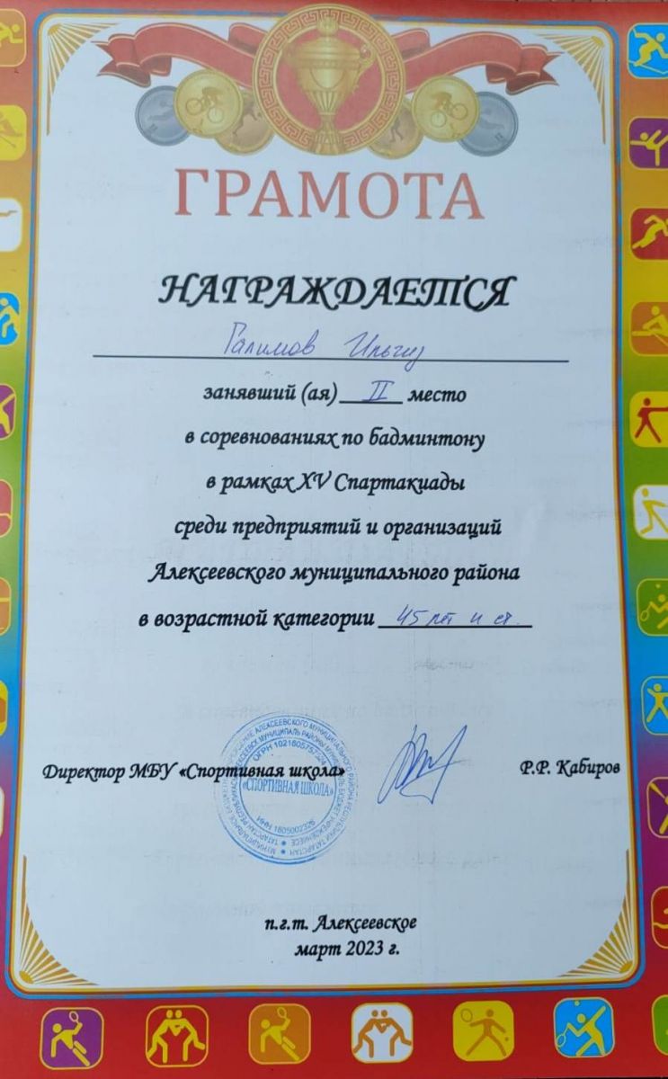 Галимов И.Н участвовал в соревнованиях по бадминтону, организованный в рамках XV Спартакиады среди предприятий и организаций Алексеевского района в возрастной категории 45 лет и старше и занял II место. Поздравляем!