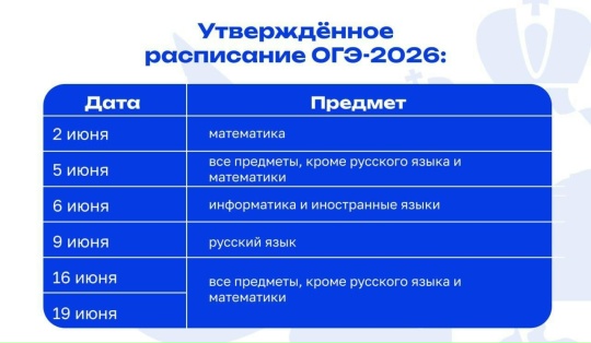 Хөрмәтле 9 һәм 11 сыйныфларны тәмамлаучыларның әти-әниләре! 2026 елга дәүләт йомгаклау аттестациясенең бердәм расписаниесе расланды. Тиешле боерыклар бастырылды инде: Ег БДИ: vk.cc/cS6tAu Ог ОГЕ: vk.cc/cS6tyq Шулай ук боерыкларда һәр уку предметы буенча имтиханнарның дәвамлылыгы һәм файдалануга рөхсәт ителгән укыту чаралары турында белергә мөмкин. Нечкәлекләре-Россия Мәгариф министрлыгы карточкаларында.